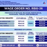 In Aurora, wage rates will increase to ₱560 for non-agriculture, ₱545 for agriculture, and ₱515 for retail and service establishments.