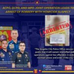 Angeles City – The Angeles City Police Office (ACPO), under the leadership of PCOL JOSELITO E VILLAROSA JR, City Director, successfully apprehended a suspect for Robbery with Homicide, in a Joint Law Enforcement Operations this year as the CIDU-QCPD lead Unit together with PS3 MPD, CIU Angeles City, Police Station 4 Angeles City, Local Government Unit of the Angeles City and the community.