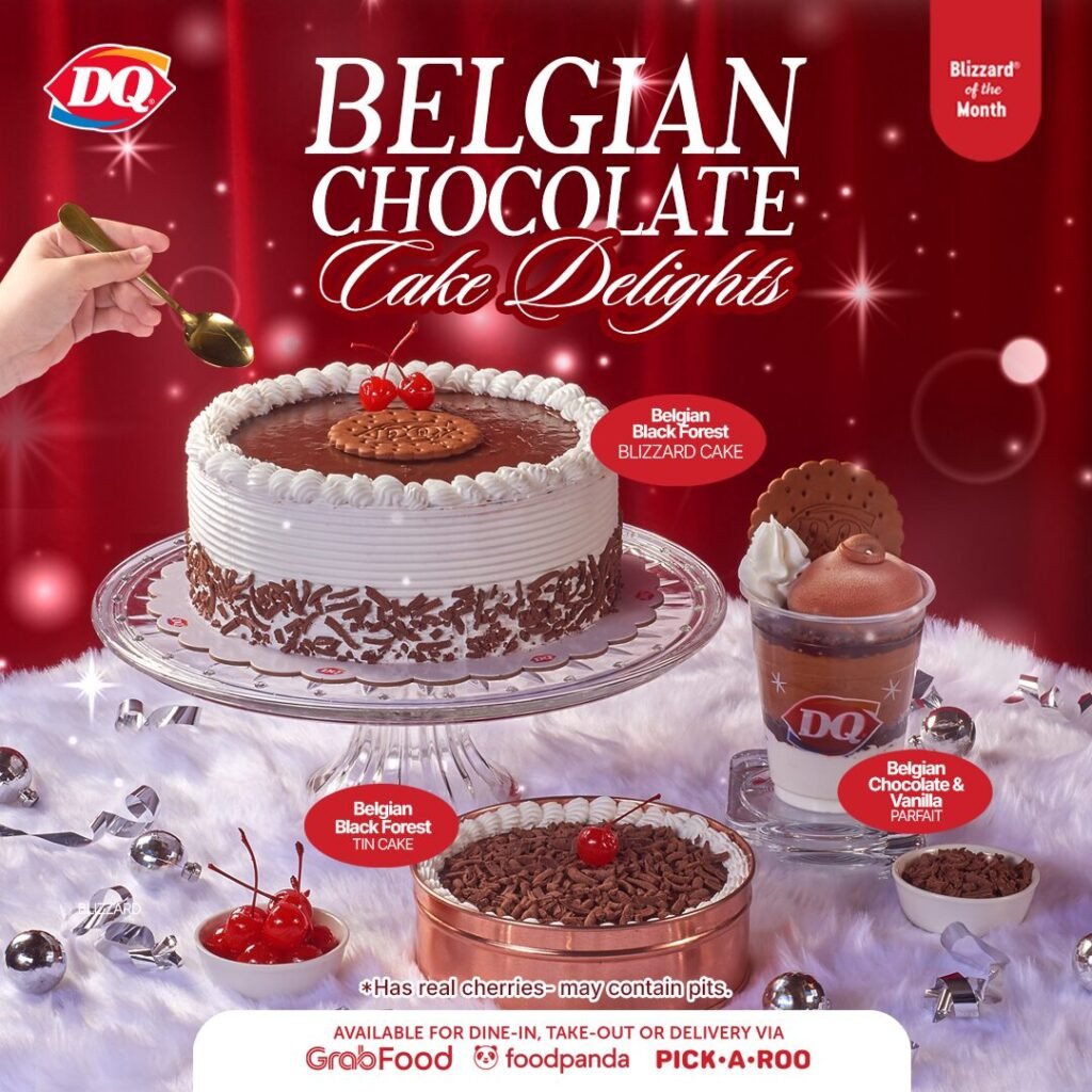 For a shareable treat that’s sure to be the centerpiece of your feast, there’s the new Belgian Chocolate Black Forest Blizzard Cake (starts at P949), a 100-percent ice cream cake made with DQ’s rich Belgian chocolate soft serve, signature cake crunch, and chocolate fudge, made more heavenly with real cherries and chocolate chunks, all wrapped in a velvety smooth frosting sprinkled with chocolate shavings and topped with more cherries and a DQ sandwich wafer.