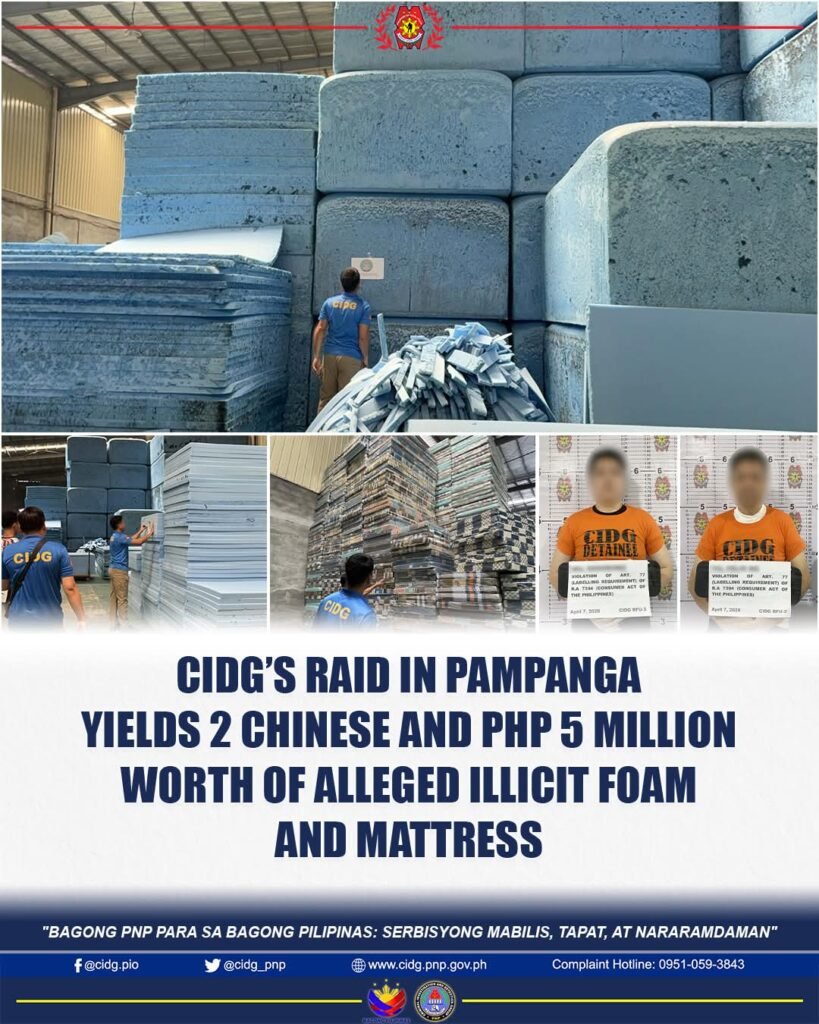 The post CIDG seizes ₱5M in illicit foam, mattress in Pampanga raid; 2 Chinese arrested first appeared on Pampanga News Now.