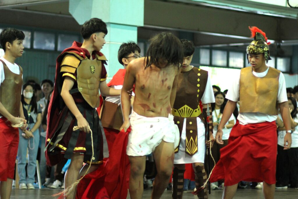 But the greatest moments unfolded in silence. For each of the Sorrowful Mysteries, Grade 10 students stepped forward to present tableau scenes; powerful still images portraying the suffering of Christ. Without a word spoken, their expressions, gestures, and frozen poses told stories of sacrifice and love. Some students watching from the crowd bowed their heads, while others watched intently, absorbing the solemnity of the moment.