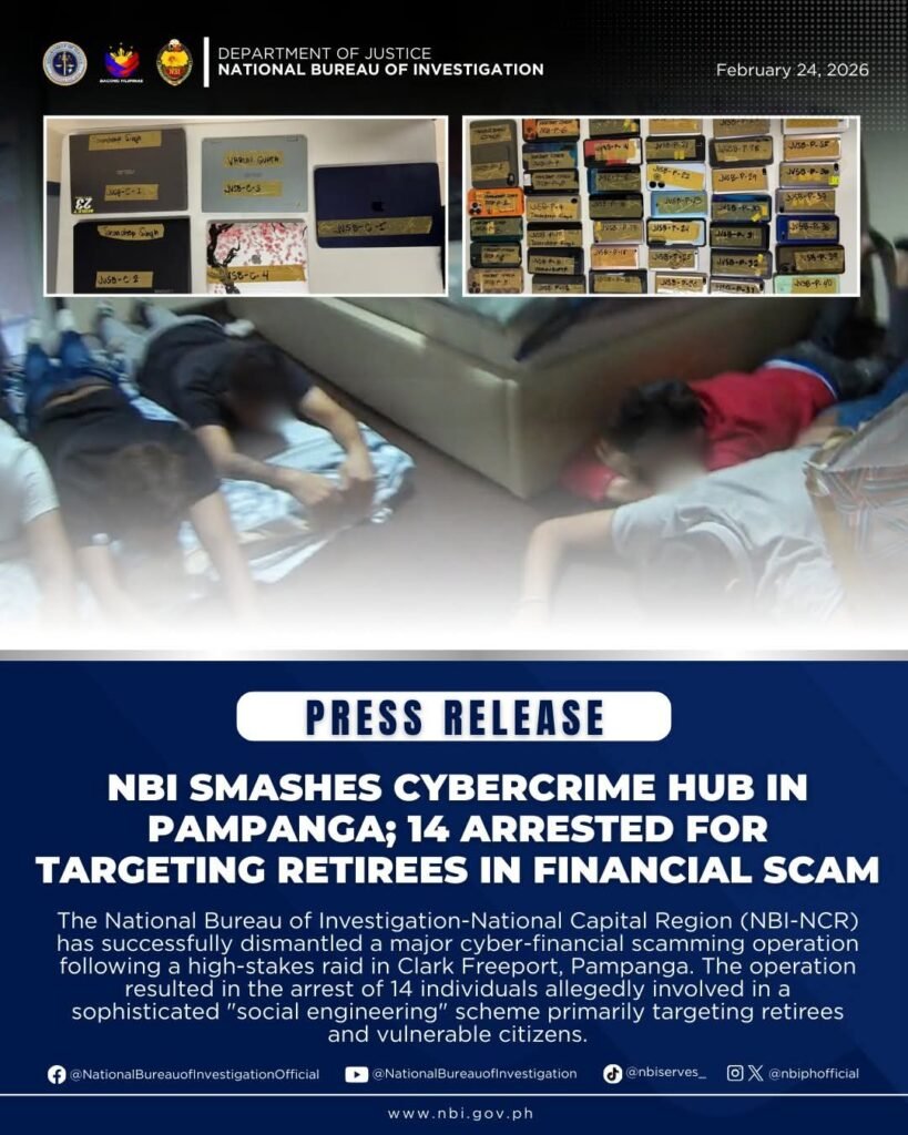 The National Bureau of Investigation-National Capital Region (NBI-NCR) has dismantled a major cyber-financial scamming operation following a high-stakes raid in Clark, resulting to the arrest of 14 individuals allegedly involved in a sophisticated “social engineering” scheme primarily targeting retirees and vulnerable citizens.